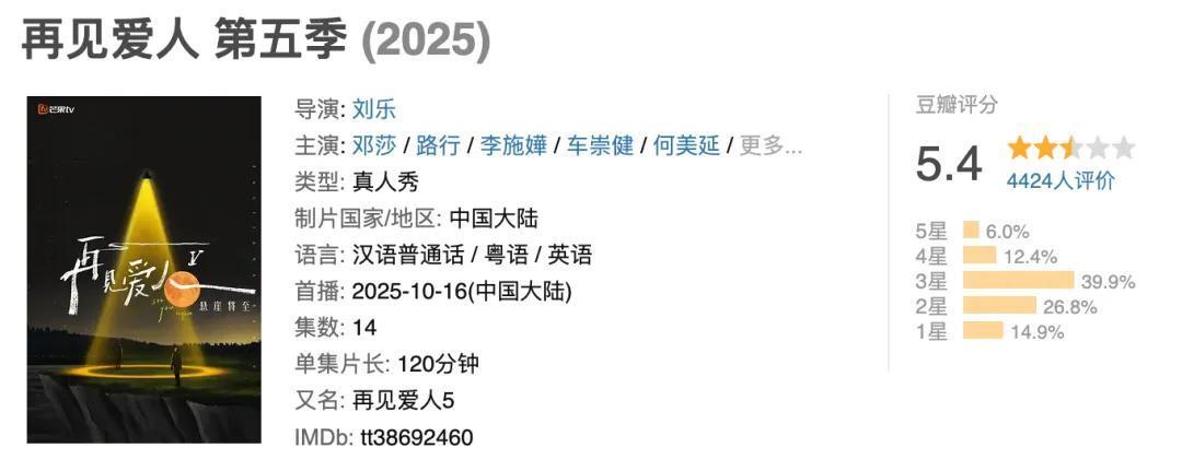 口碑方面,《再见爱人》第五季最后以5.4的豆瓣评分创下系列新低,比血雨腥风的上一季还低一分。